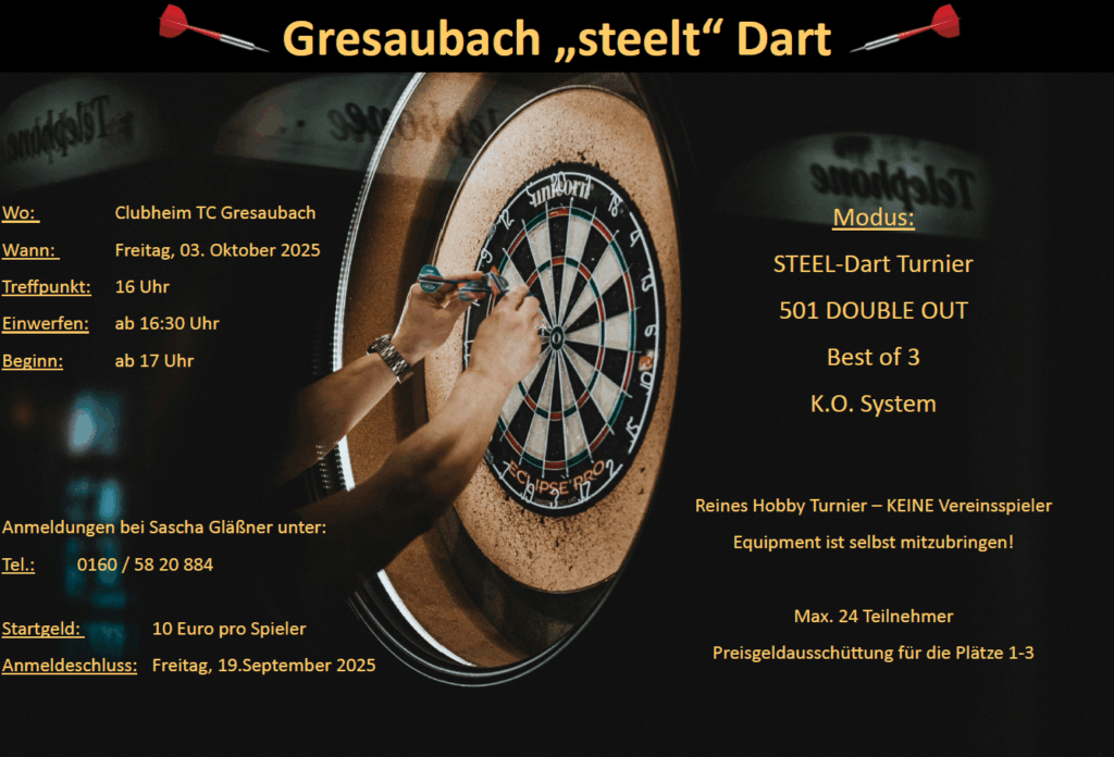 Am Freitag, dem 3. Oktober 2025 findet im Clubheim des TC Gresaubach ein Steel-Dart Turnier statt. Es ist ein reines Hobby Turnier, an dem keine Vereinsspieler teilnehmen dürfen. Das Equipment ist selbst mitzubringen. Gespielt wird 501 DOUBLE OUT, Best of 3 und K.O. System. Treffpunkt ist um 16 Uhr im Clubheim. Ab 16.30 Uhr kann sich eingeworfen werden und um 17 Uhr beginnt das Turnier. Anmeldungen nimmt Sascha Gläßner entgegen unter: 0160 / 5820884